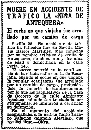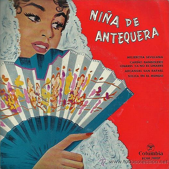 La Niña de Antequera fue el nombre artístico de María Barrús Martínez, nacida en la calle Palomos de la malagueña ciudad de Antequera en el año 1920. La familia se trasladó a la provincia de Jaén (unos me dicen que a Huelma, otros que a Cambil) y allí, con sólo 12 años, dio a conocer sus excelentes cualidades canoras, llegando a profesionalizarse hasta alcanzar plena popularidad antes de sus 30 años con el espectáculo ‘Sol Andaluz’ en el teatro sevillano de San Fernando. Triunfa también en el Price de Madrid y recorre varias veces España entera con los espectáculos de canción y cante flamencos al uso en los años cincuenta y sesenta. Recibió galardones como la Banda del Estrellato o la Medalla al Mérito Artístico, siéndole entregada ésta por Pepe Marchena.