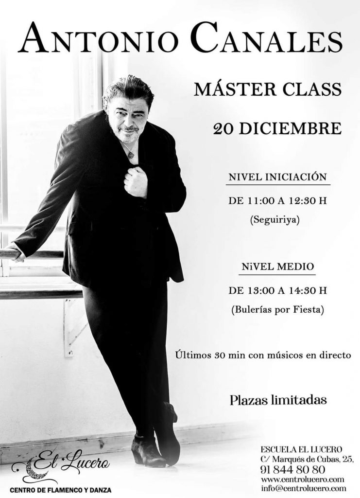 Antonio Canales imparte su magisterio en El Lucero de Madrid. El maestro trianero ofrecerá una master classs este domingo en el Centro de Flamenco y Danza El Lucero. Para los alumnos de nivel iniciación (seguiriyas), el horario será de 11.00 a 12.30 horas; y para los de nivel avanzado (bulerías por fiesta) de 13.00 a 14.30 horas.