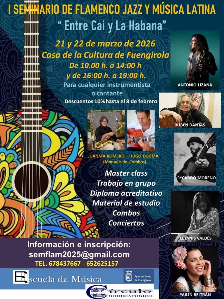 Participa junto a otros destacados artistas flamencos, como el guitarrista Rycardo Moreno o el percusionista Rubem Dantas, en el I Seminario de Flamenco, Jazz y Música Latina ‘Entre Cai y La Habana’, que acogerá la Casa de la Cultura de Fuengirola los días 21 y 22 de marzo.