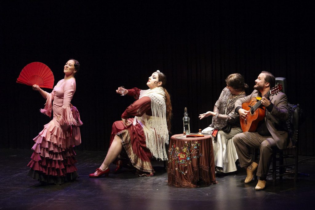 Choni, abanico en ristre, baila la guajira con gracia y donaire. Prima el braceo grácil y el juego del abanico. La guitarra de Cantizano suena cristalina. La voz de Acuña es muy flamenca, con ecos profundos. En el zapateado, Choni disfruta y se gusta. Todos actúan (como actores) a la par que interpretan (como músicos). Una delicia.