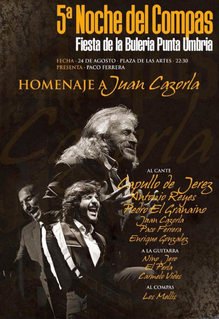 Capullo de Jerez, Pedro El Granaíno y Antonio Reyes encabezan el cartel de la V Fiesta de la Bulería de Punta Umbría, que homenajea en esta edición a Juan Cazorla, cantaor local de origen almeriense. La cita es el 24 de agosto.