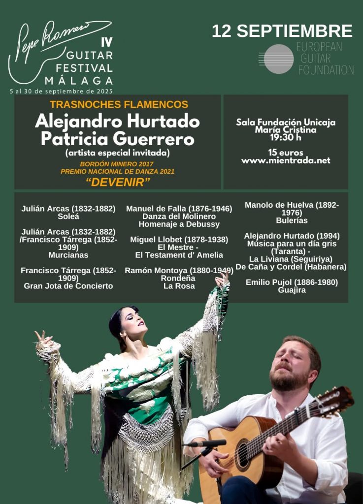 19.30 horas. IV Pepe Romero Guitar Festival Málaga. Sala Fundación Unicaja María Cristina. ‘Devenir’. Alejandro Hurtado, con Patricia Guerrero como artista invitada al baile.