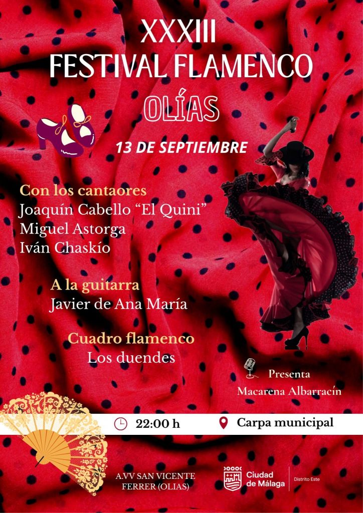 22.00 horas. XXXIII Festival de Olías, barrio de Málaga. El Quini, Miguel Astorga e Iván Chaskío, al cante, Javier de Ana María, al toque, y el cuadro flamenco Los Duendes. Presenta Macarena Albarracín.