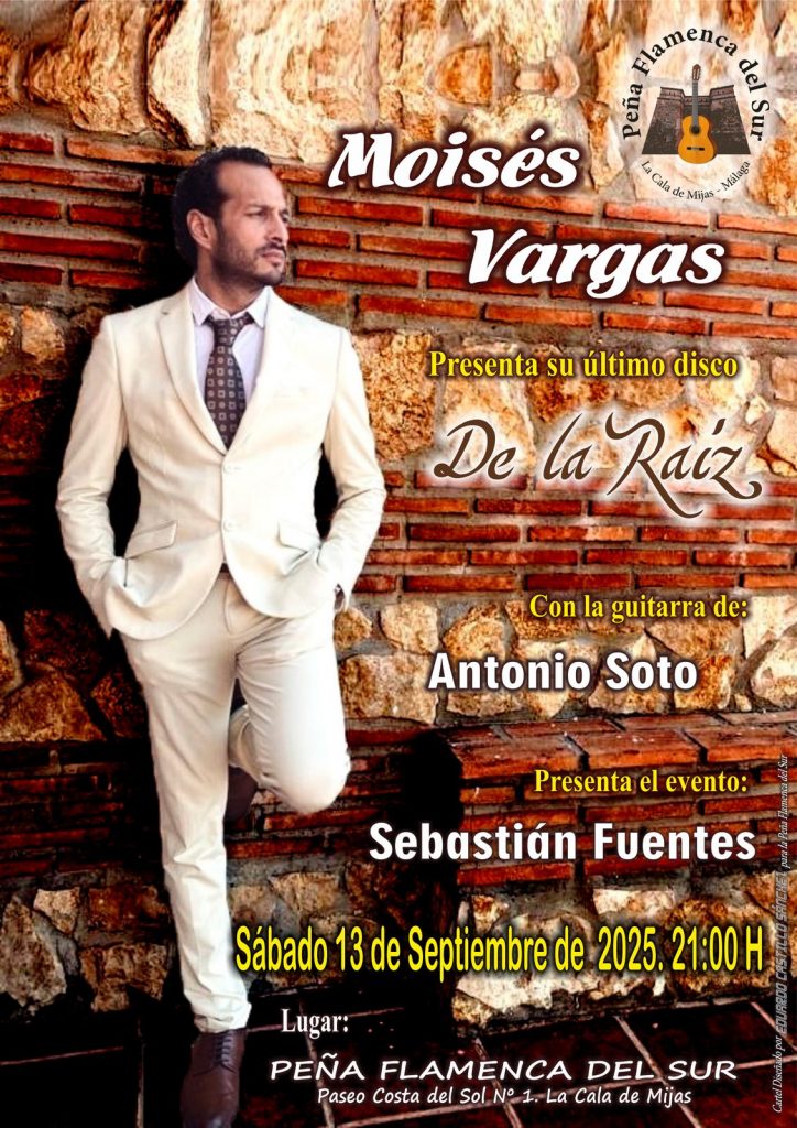 21.00 horas. Peña del Sur de La Cala de Mijas. Moisés Vargas presenta su nuevo disco, ‘De la raíz’, con Antonio Soto, a la guitarra. Presenta Sebastián Fuentes.