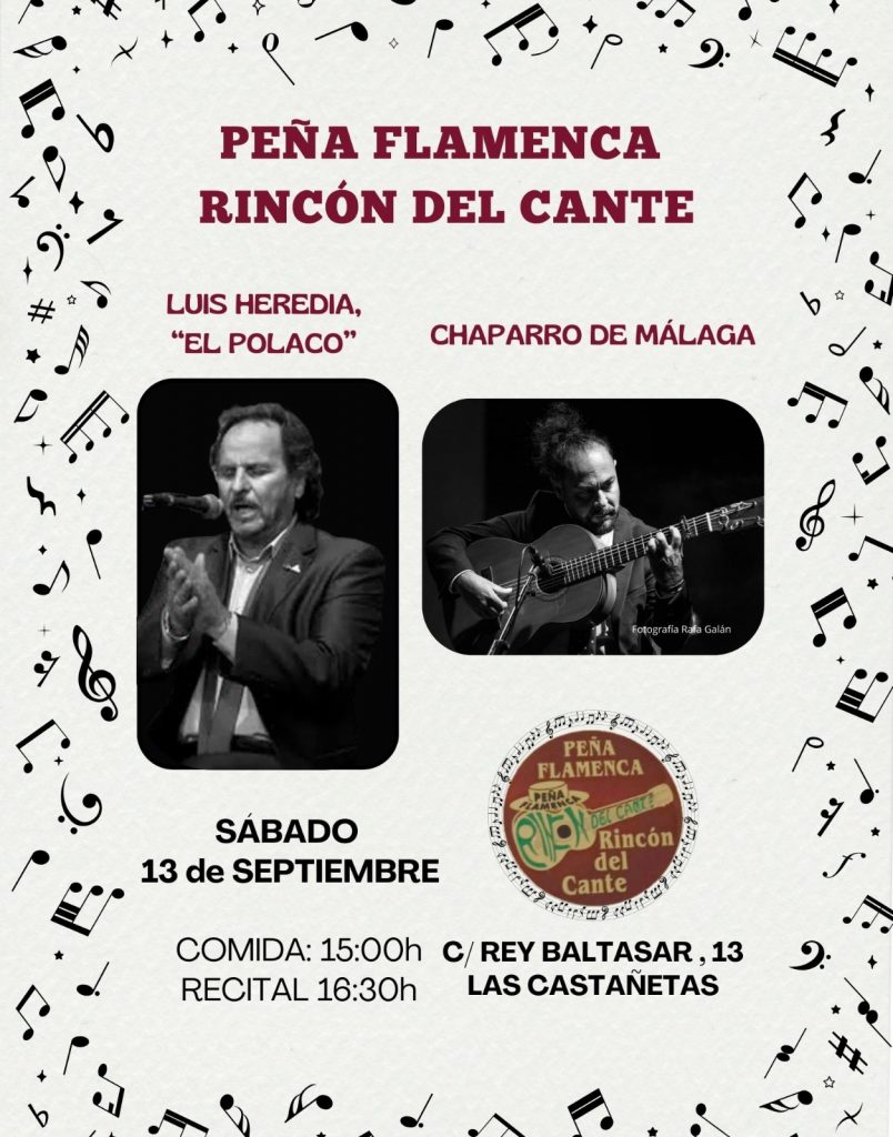 16.30 horas. Peña Rincón del Cante Las Castañetas de Campanillas, barrio de Málaga. Luis Heredia El Polaco, al cante, y Chaparro de Málaga, al toque.