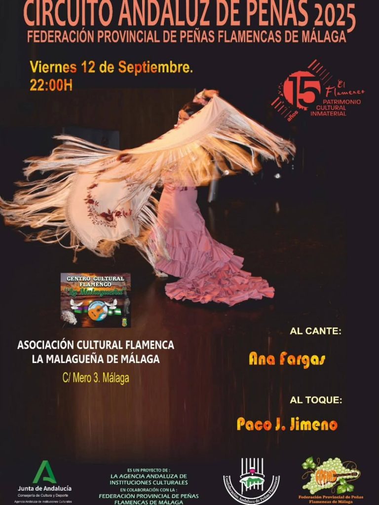 22.00 horas. Centro Cultural Flamenco La Malagueña de Málaga. Circuito Andaluz de Peñas, organizado por la Agencia Andaluza de Instituciones Culturales en colaboración con la Federación Provincial de Peñas Flamencas de Málaga. Ana Fargas, al cante, y Paco Javier Jimeno, a la bajañí.