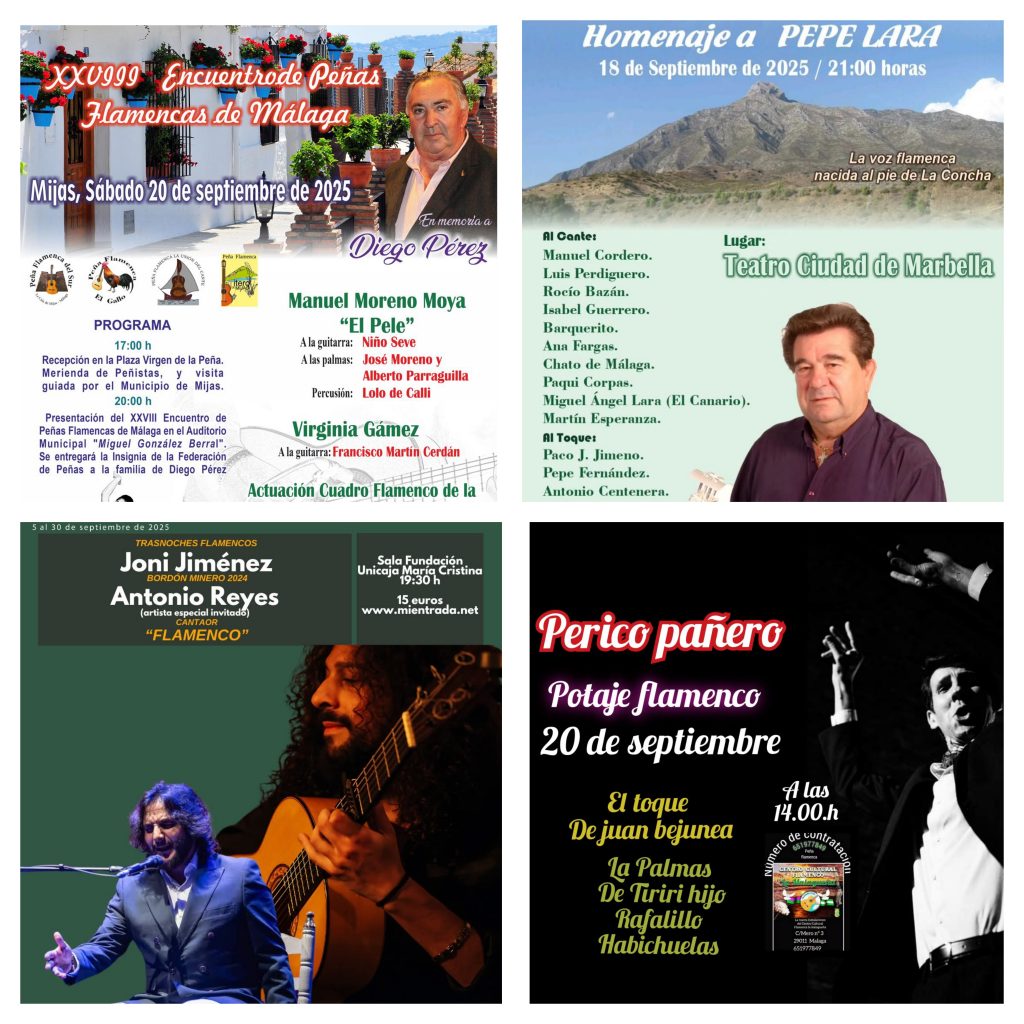 17.30, 19.00 y 20.30 horas: Teatro Flamenco Málaga Club. Programación del 15 al 21 de septiembre: Toñi Estepa, Víctor Bravo, Laura Triviño y José Franco, al baile, y su cuadro.