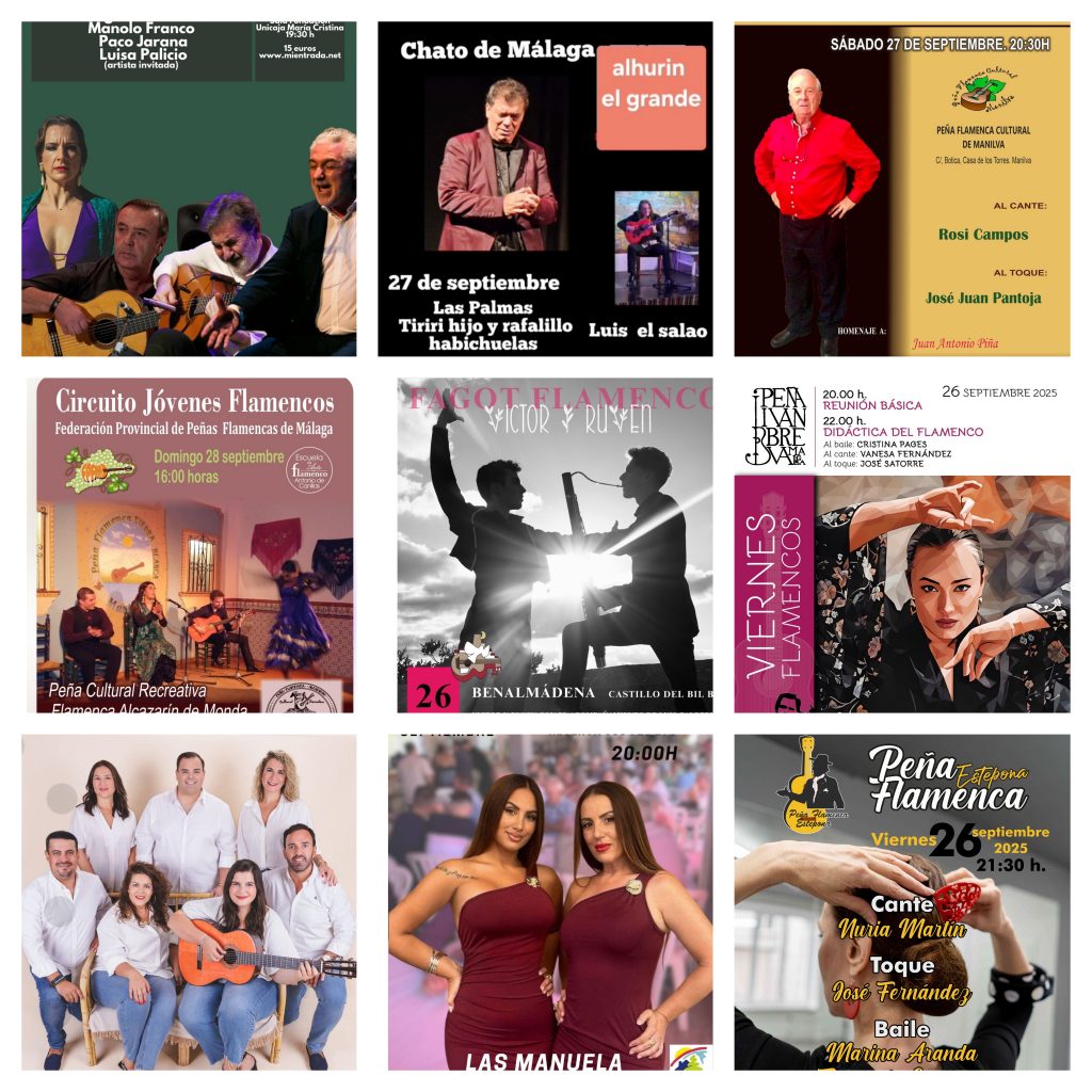 17.30, 19.00 y 20.30 horas: Teatro Flamenco Málaga Club. Programación del 22 al 28 de septiembre: Laura Triviño, José Franco, Jesús Hinojosa, Vanessa Cortés, Antonio González y Jésica Ruiz, al baile, Jesule de Utrera, David Bastidas, La Boterita y Rosa Linero, al cante, y Antonio Delgado, Curro de María y David de Ana, al toque.