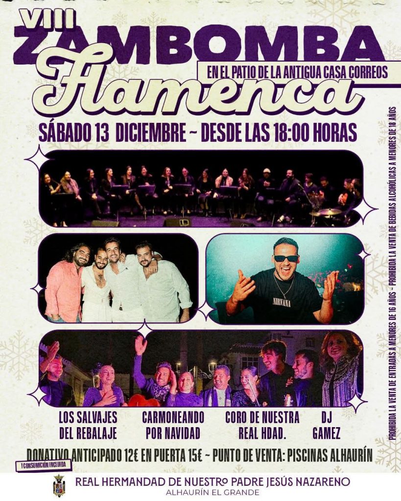 18.00 horas. Patio de la Antigua Casa Correos de Alhaurín El Grande. Hermandad de Nuestro Padre Jesús Nazareno. VIII Zambomba Flamenca. Los Salvajes del Rebalaje, Carmoneando por Navidad y Coro de la Hermandad.