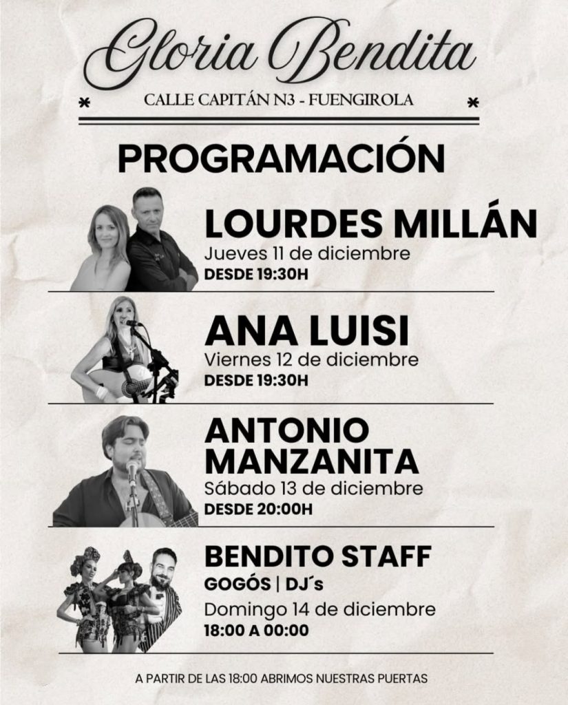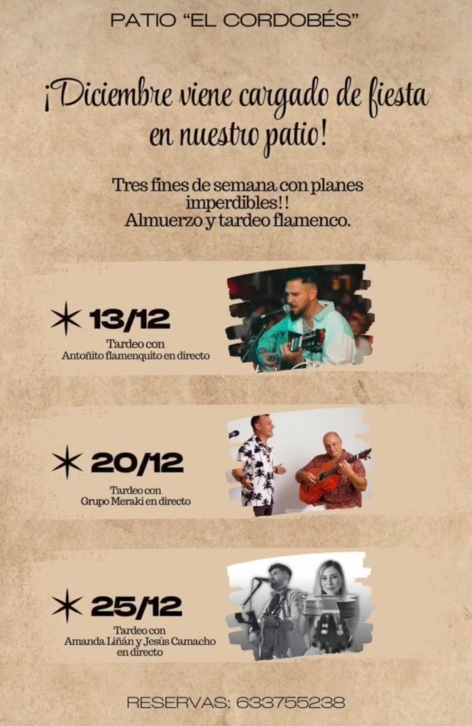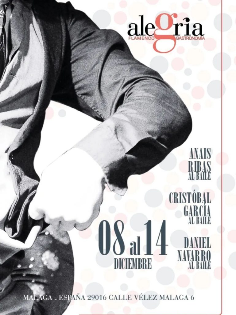 16.00, 18.00, 20.00 y 22.30 horas: Tablao Alegría de Málaga. Programación del 8 al 14 de diciembre: Anais Ribas, Cristóbal García y Daniel Navarro, al baile, y su cuadro.