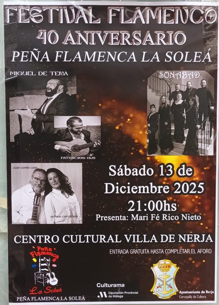 21.00 horas. Centro Cultural Villa de Nerja. Festival 40 Aniversario de la Peña La Soleá. Miguel de Tena y Antonia Contreras, al cante, Patrocinio Hijo y Juan Ramón Caro, al toque, y Sonabad. Presenta Mari Fé Rico. Entrada libre hasta completar el aforo.