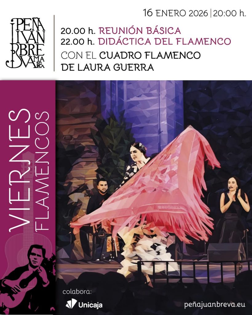 17.00, 18.30, 20.00 y 21.30 horas: Teatro Flamenco Málaga Club. Programación del 12 al 18 de enero: Blanca Trillo, Víctor Bravo, Rocío Rodríguez, Jésica Ruiz, Carmen Yanes, Rafael Campallo, Yaiza Gámez y María Gámez, al baile, Rosa Linero, Edu López, María José Bueno, Jesule de Utrera y Vanessa Fernández, al cante, y Javi Leal y Antonio Andrade, al toque.