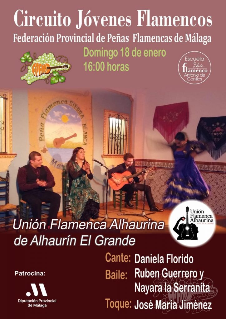 16.00 horas. Peña Unión Flamenca Alhaurina de Alhaurín El Grande. Circuito Jóvenes Flamencos, organizado por la Federación Provincial de Peñas Flamencas de Málaga con el patrocinio de la Diputación Provincial. Rubén Guerrero y Nayara La Serranita, al baile, Daniela Florido, al cante, y José María Jiménez, al toque.