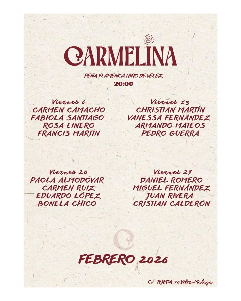 20.00 horas. Carmelina. Peña Niño de Vélez de Vélez Málaga. Carmen Camacho, al baile, Fabiola Santiago y Rosa Linero, al cante, y Francis Martín, al toque.