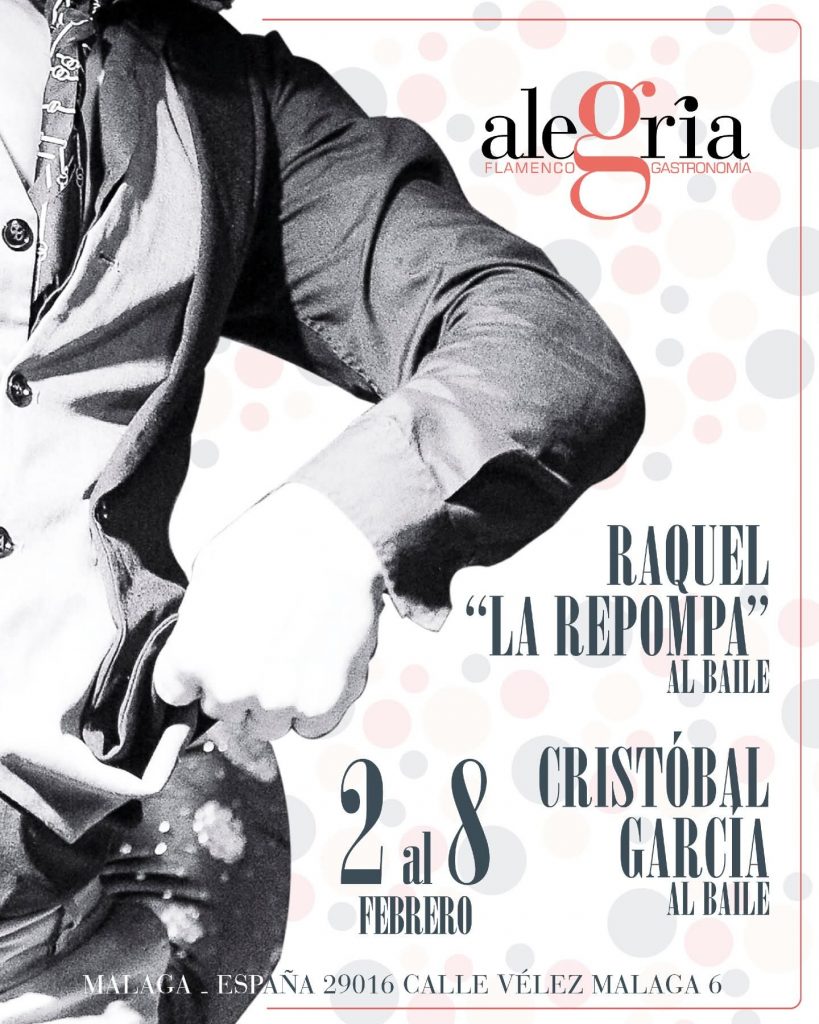 16.00, 18.00, 20.00 y 22.30 horas: Tablao Alegría de Málaga. Programación del 2 al 8 de febrero: Raquel La Repompa y Cristóbal García, al baile, y su cuadro flamenco.
