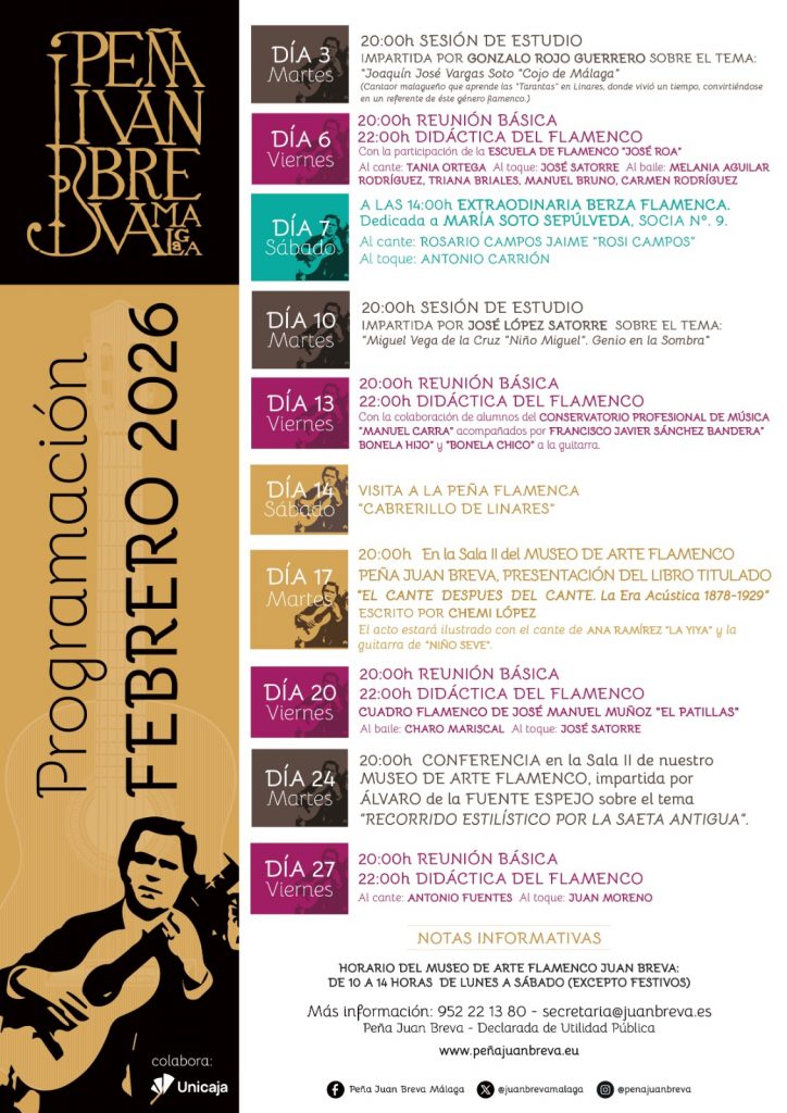 17.00, 18.30, 20.00 y 21.30 horas: Teatro Flamenco Málaga Club. Programación del 2 al 8 de febrero: Lorena Franco, Ricardo Moro, Claudia Leiva, Gema Espejo, José Franco, Vanessa Cortés, Ana Pastrana y María Gámez, al baile, Carmen Ruiz, Rosa Linero, David Bastidas, Juan Francisco Rivera, Rocío La Boterita y Armando Mateos, al cante, y Pedro Guerra y Curro de María, al toque.
