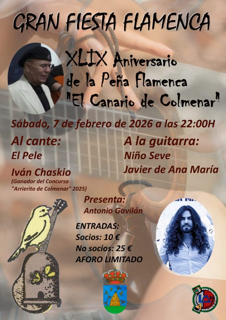 22.00 horas. XLIX Aniversario de la Peña El Canario de Colmenar. Gran Fiesta Flamenca. El Pele e Iván Chaskío, ganador del Concurso Arrierito de Colmenar 2025, al cante, y Niño Seve y Javier de Ana María, a la bajañí. Presenta Antonio Gavilán. ENTRADAS AGOTADAS.