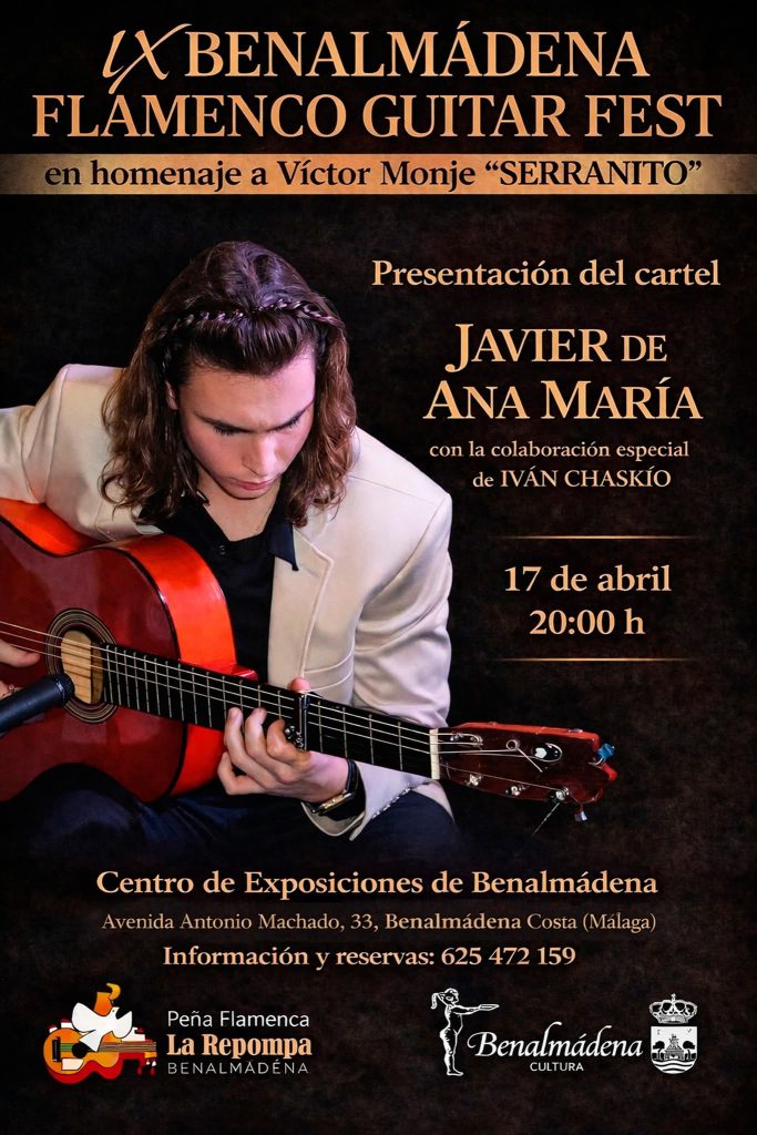 20.00 horas. Centro de Exposiciones de Benalmádena. Presentación del IX Benalmádena Guitar Fest, en homenaje a Víctor Monge Serranito, con Javier de Ana María, a la guitarra, y la colaboración especial de Iván Chaskío, al cante.