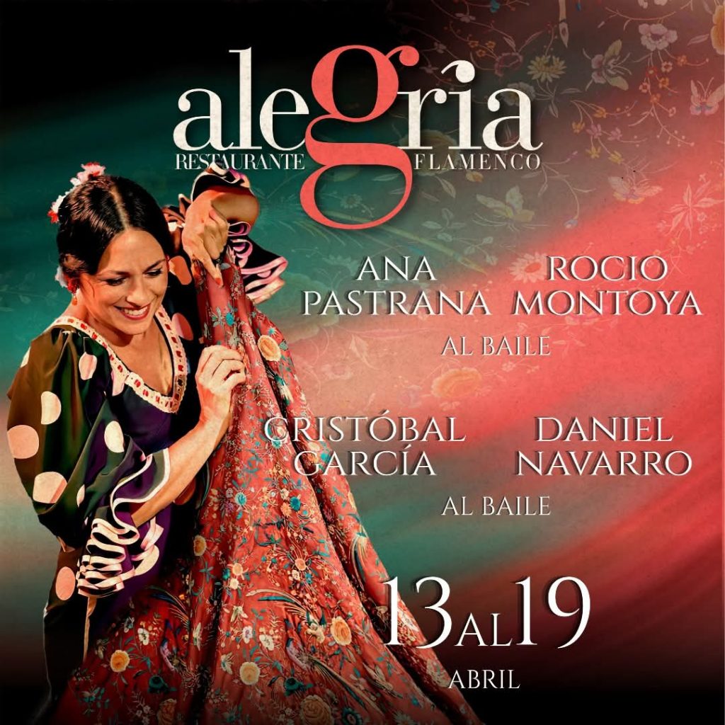 16.00, 18.00, 20.00 y 22.30 horas: Tablao Alegría de Málaga. Programación del 13 al 19 de abril: Ana Pastrana, Rocío Montoya, Cristóbal García y Daniel Navarro, al baile, y su cuadro flamenco.