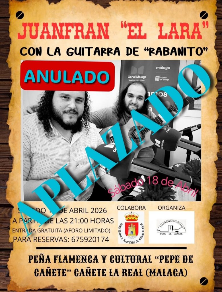 21.00 horas. Peña Pepe de Cañete de Cañete La Real. Juanfran El Lara, al cante, y Rabanito, al toque. INICIALMENTE PREVISTO EL SÁBADO 11 DE ABRIL. ANULADO HASTA NUEVA FECHA.