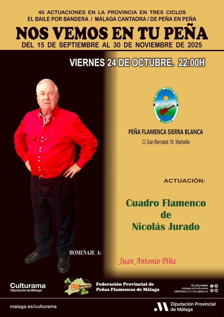 22.00 horas. Peña Sierra Blanca de Marbella. Ciclo Nos vemos en tu peña, organizado por la Federación Provincial de Peñas Flamencas de Málaga con el patrocinio de la Diputación Provincial. Cuadro Flamenco de Nicolás Jurado.
