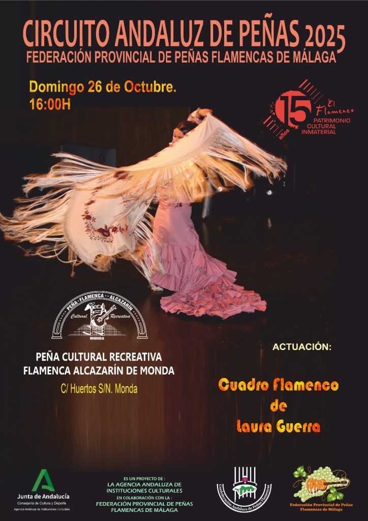 16.00 horas. Peña Alcazarín de Monda. Circuito Andaluz de Peñas, organizado por la Agencia Andaluza de Instituciones Culturales con la colaboración de la Federación Provincial de Peñas Flamencas de Málaga. Cuadro Flamenco de Laura Guerra.