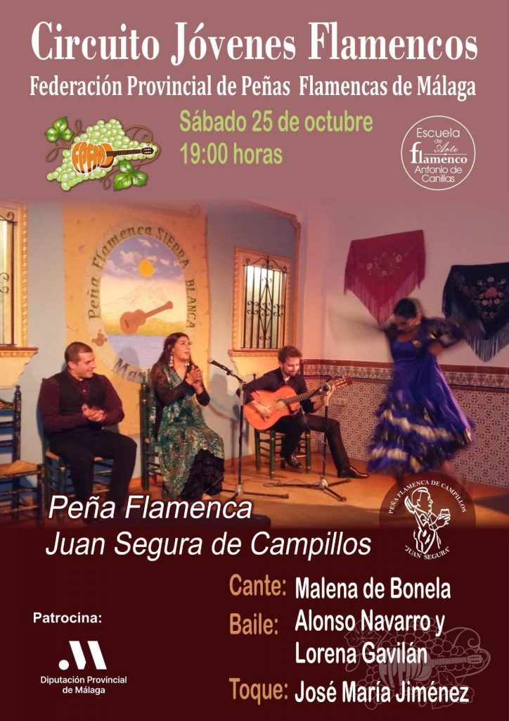 19.00 horas. Peña Juan Segura de Campillos. Circuito de Jóvenes Flamencos, organizado por la Federación Provincial de Peñas Flamencas de Málaga, con el patrocinio de la Diputación Provincial. Alonso Navarro y Lorena Gavilán, al baile, Malena de Bonela, al cante, y José María Jiménez, a la bajañí.