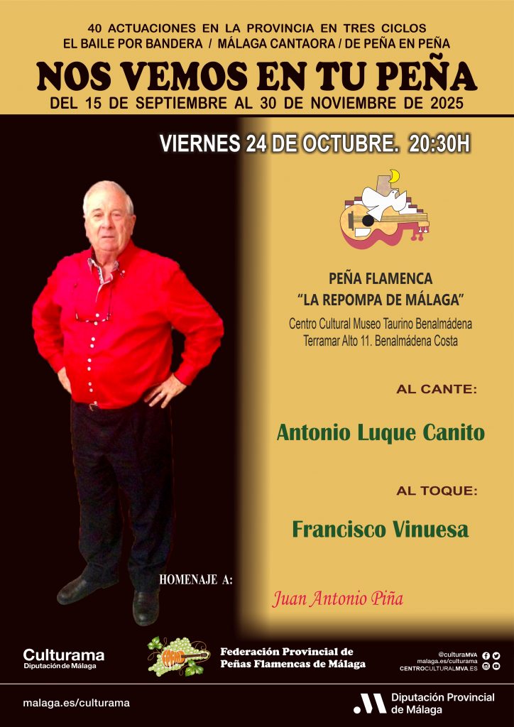 20.30 horas. Peña La Repompa de Benalmádena. Centro Cultural Museo Taurino. Ciclo Nos vemos en tu peña, organizado por la Federación Provincial de Peñas Flamencas de Málaga con el patrocinio de la Diputación Provincial. Antonio Luque Canito, al cante, Francisco Vinuesa, a la sonanta.