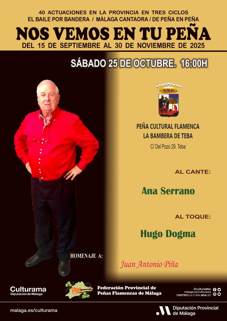 16.00 horas. Peña La Bambera de Teba. Ciclo Nos vemos en tu peña, organizado por la Federación Provincial de Peñas Flamencas de Málaga con el patrocinio de la Diputación Provincial. Ana Serrano, al cante, y Hugo Dogma, al toque.