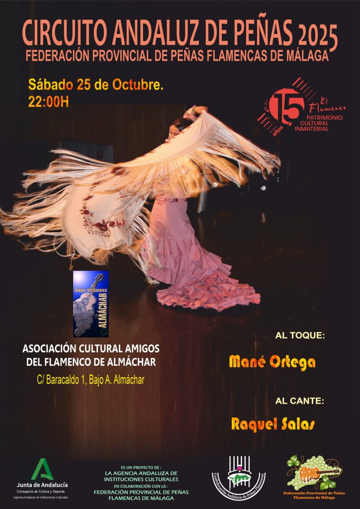 22.00 horas. Peña Amigos del Flamenco de Almáchar. Circuito Andaluz de Peñas, organizado por la Agencia Andaluza de Instituciones Culturales con la colaboración de la Federación Provincial de Peñas Flamencas de Málaga. Raquel Salas, al cante, y Mané Ortega, a la guitarra.