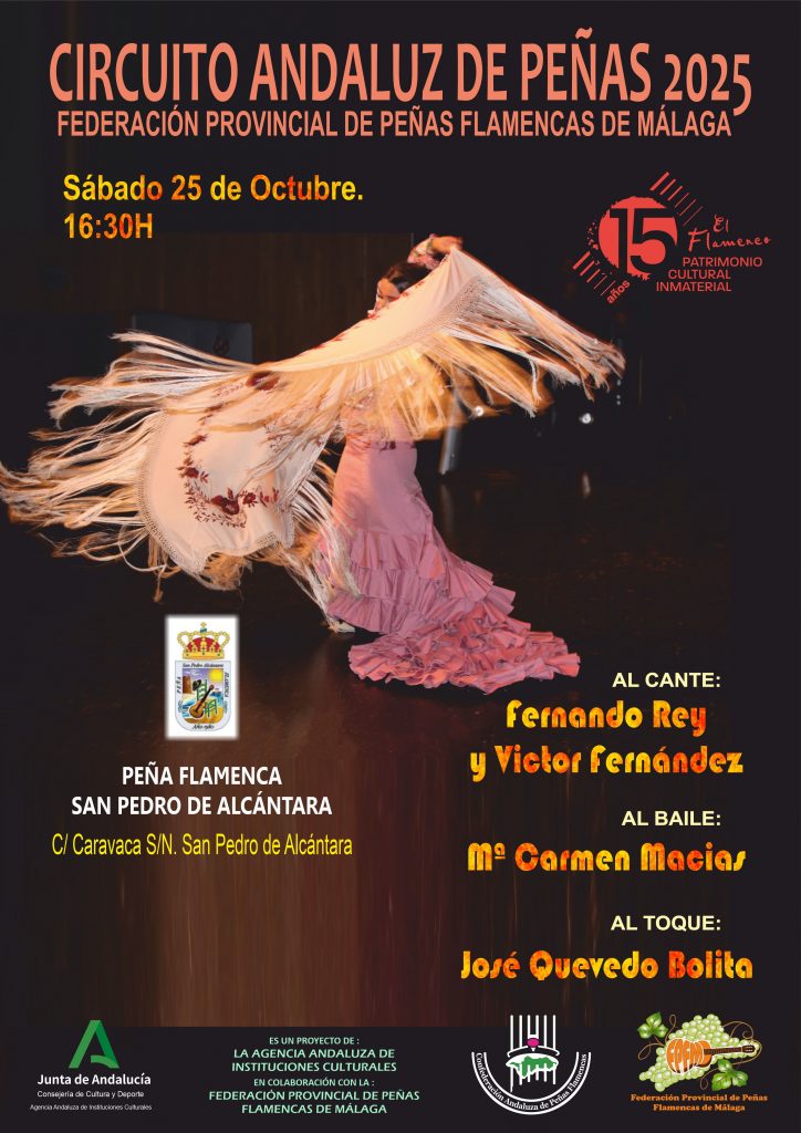 16.30 horas. Peña de San Pedro de Alcántara. Circuito Andaluz de Peñas, organizado por la Agencia Andaluza de Instituciones Culturales con la colaboración de la Federación Provincial de Peñas Flamencas de Málaga. Mari Carmen Macías, al baile, José Quevedo Bolita, a la guitarra, y Fernando Rey y Víctor Fernández, al cante.