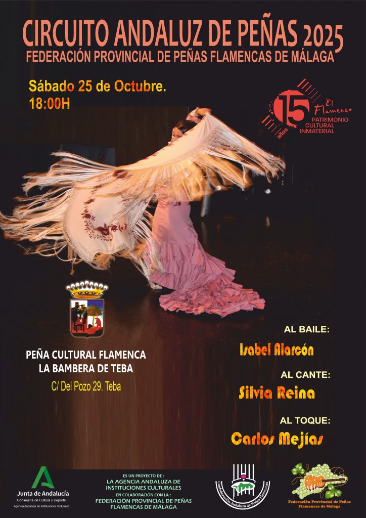 18.00 horas. Peña La Bambera de Teba. Circuito Andaluz de Peñas, organizado por la Agencia Andaluza de Instituciones Culturales con la colaboración de la Federación Provincial de Peñas Flamencas de Málaga. Isabel Alarcón, al baile, Silvia Reina, al cante, y Carlos Mejías, a la guitarra.