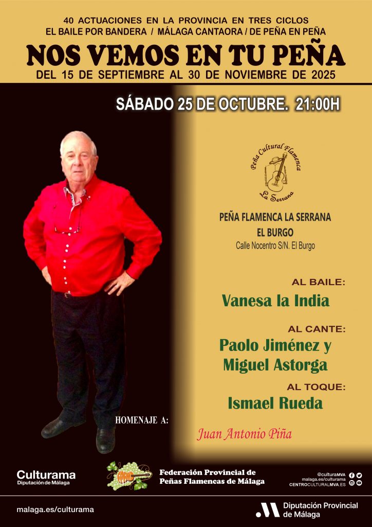 21.00 horas. Peña La Serrana de El Burgo. Ciclo Nos vemos en tu peña, organizado por la Federación Provincial de Peñas Flamencas de Málaga con el patrocinio de la Diputación Provincial. Vane La India, al baile, Paolo Jiménez y Miguel Astorga, al cante, e Ismael Rueda, a la guitarra.