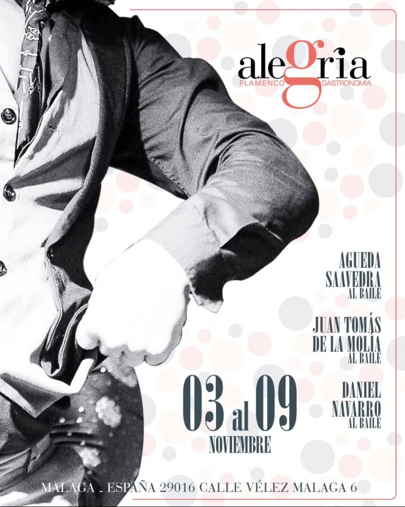 16.00, 18.00, 20.00 y 22.30 horas: Tablao Alegría de Málaga. Programación del 3 al 9 de noviembre: Águeda Saavedra, Juan Tomás de la Molía y Daniel Navarro, al baile, y su cuadro.
