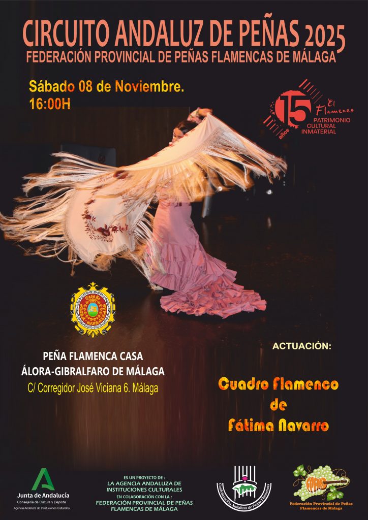 16.00 horas. Peña Casa de Álora Gibralfaro de Málaga. Circuito Andaluz de Peñas, organizado por la Agencia Andaluza de Instituciones Culturales con la colaboración de la Federación Provincial de Peñas Flamencas de Málaga. Cuadro Flamenco de Fátima Navarro.