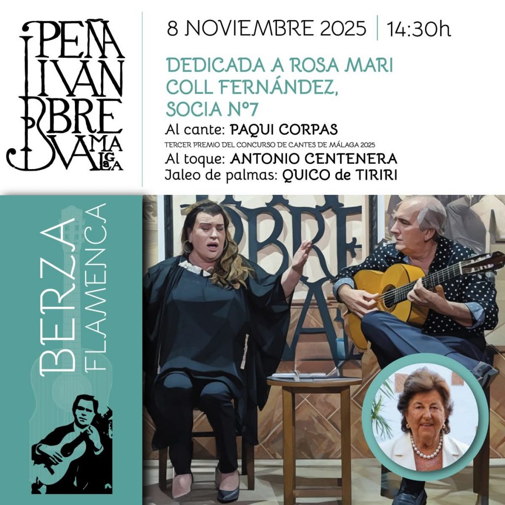 14.30 horas. Peña Juan Breva de Málaga. Berza Flamenca, con Paqui Corpas, al cante, Antonio Centenera, al toque, y Quico de Tiriri, a las palmas.