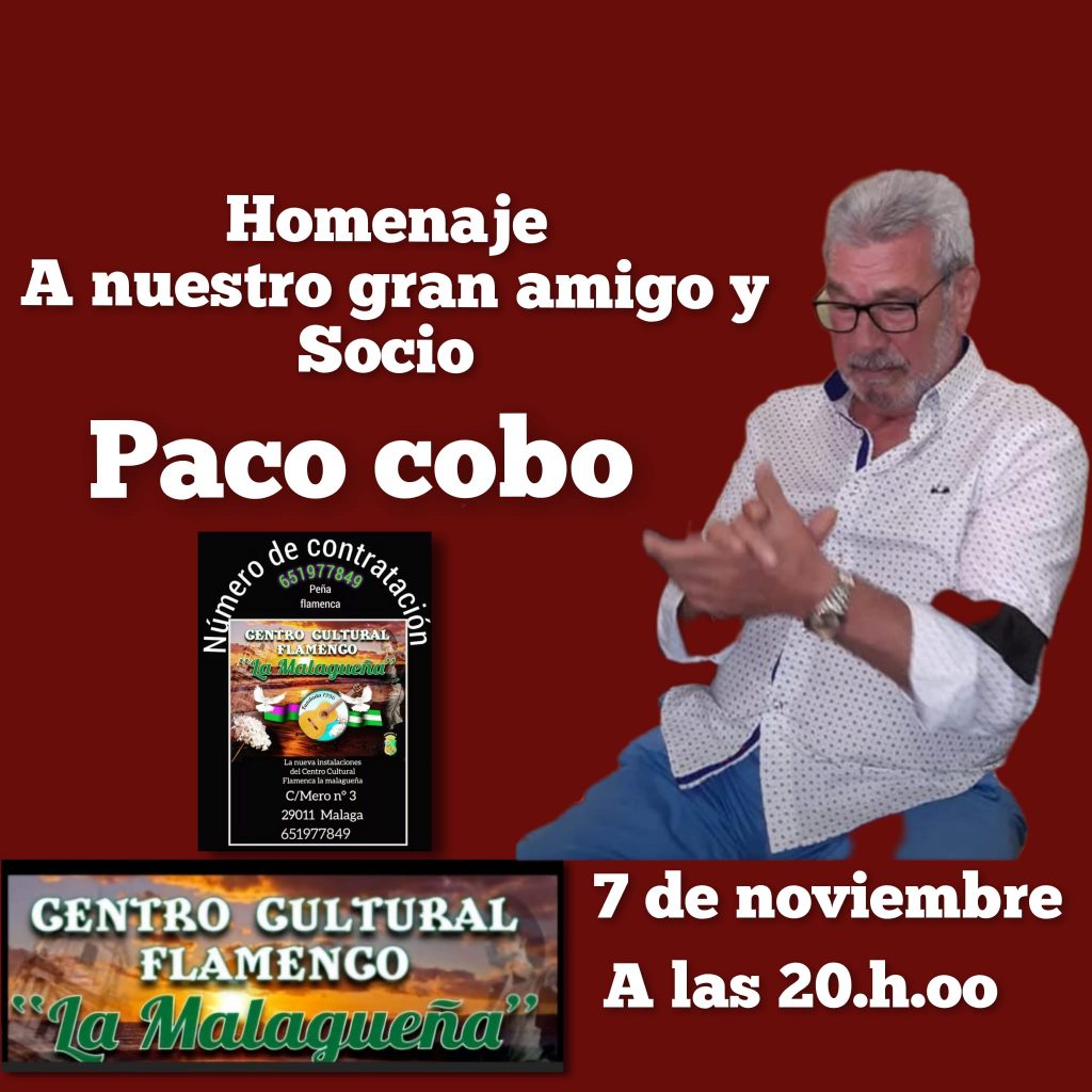 20.00 horas. Centro Cultural Flamenco La Malagueña de Málaga. Homenaje a Paco Cobo, socio fallecido de la peña.