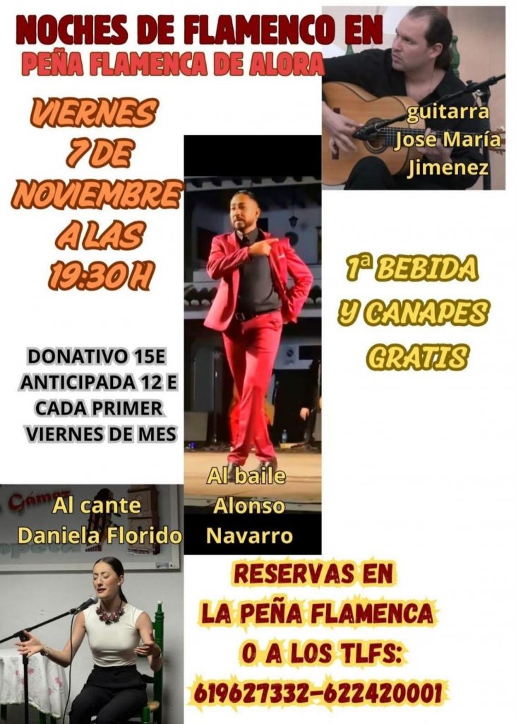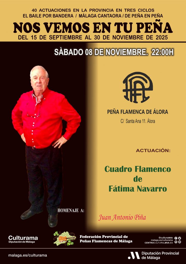 22.00 horas. Peña de Álora. Ciclo Nos vemos en tu Peña, organizado por la Federación Provincial de Peñas Flamencas de Málaga, con el patrocinio de la Diputación Provincial. Cuadro Flamenco de Fátima Navarro.