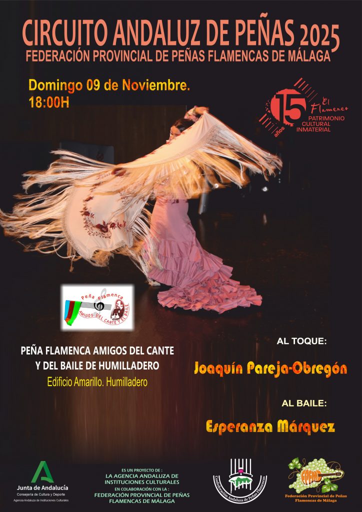 18.00 horas. Peña Casa de Álora Gibralfaro de Málaga. Circuito Andaluz de Peñas, organizado por la Agencia Andaluza de Instituciones Culturales con la colaboración de la Federación Provincial de Peñas Flamencas de Málaga. Esperanza Márquez, al baile, y Joaquín Pareja-Obregón, al toque.