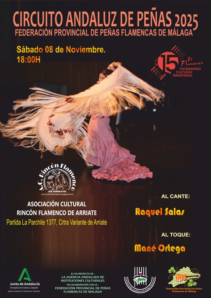 18.00 horas. Peña Rincón del Cante de Arriate. Circuito Andaluz de Peñas, organizado por la Agencia Andaluza de Instituciones Culturales con la colaboración de la Federación Provincial de Peñas Flamencas de Málaga. Raquel Salas, al cante, y Mané Ortega, al toque.