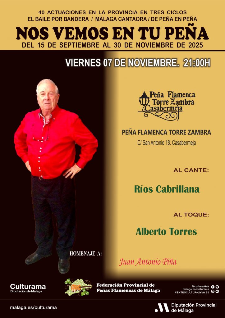 21.00 horas. Peña Torre Zambra de Casabermeja. Ciclo Nos vemos en tu Peña, organizado por la Federación Provincial de Peñas Flamencas de Málaga, con el patrocinio de la Diputación Provincial. Ríos Cabrillana, al cante, y Alberto Torres, al toque.
