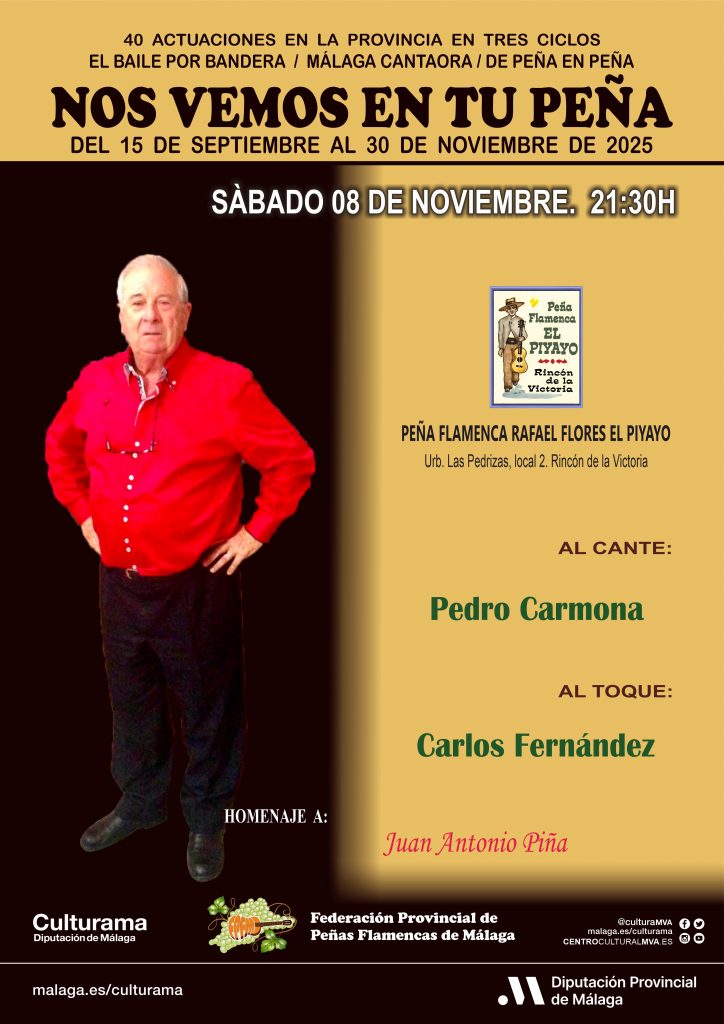 21.30 horas. Peña El Piyayo de Rincón de la Victoria. Ciclo Nos vemos en tu Peña, organizado por la Federación Provincial de Peñas Flamencas de Málaga, con el patrocinio de la Diputación Provincial. Pedro Carmona, al cante, y Carlos Fernández, al toque.