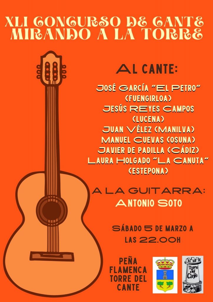 22.00 horas Peña Torre del Cante de Alhaurín de la Torre. Primera preliminar del XLI Concurso Mirando a la Torre. El Petro, Jesús Reyes, Juan Vélez, Manuel Cuevas, Javier de Padilla y La Canuta, al cante, y Antonio Soto, a la guitarra.