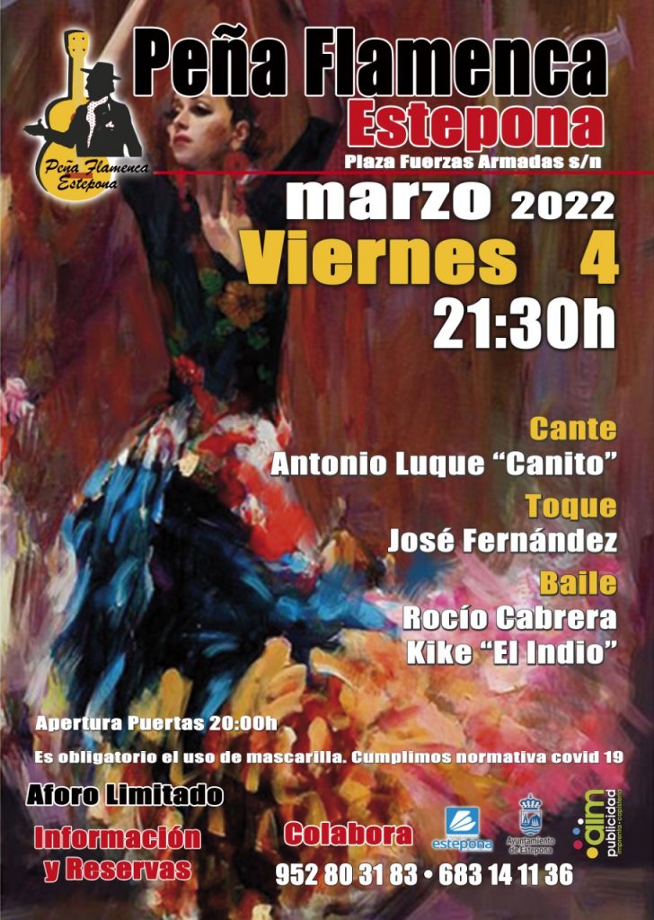 21.30 horas. Peña de Estepona. Kike El Indio y Rocío Cabrera, al baile, Antonio Luque Canito, al cante, y Pepe Fernández, a la guitarra.