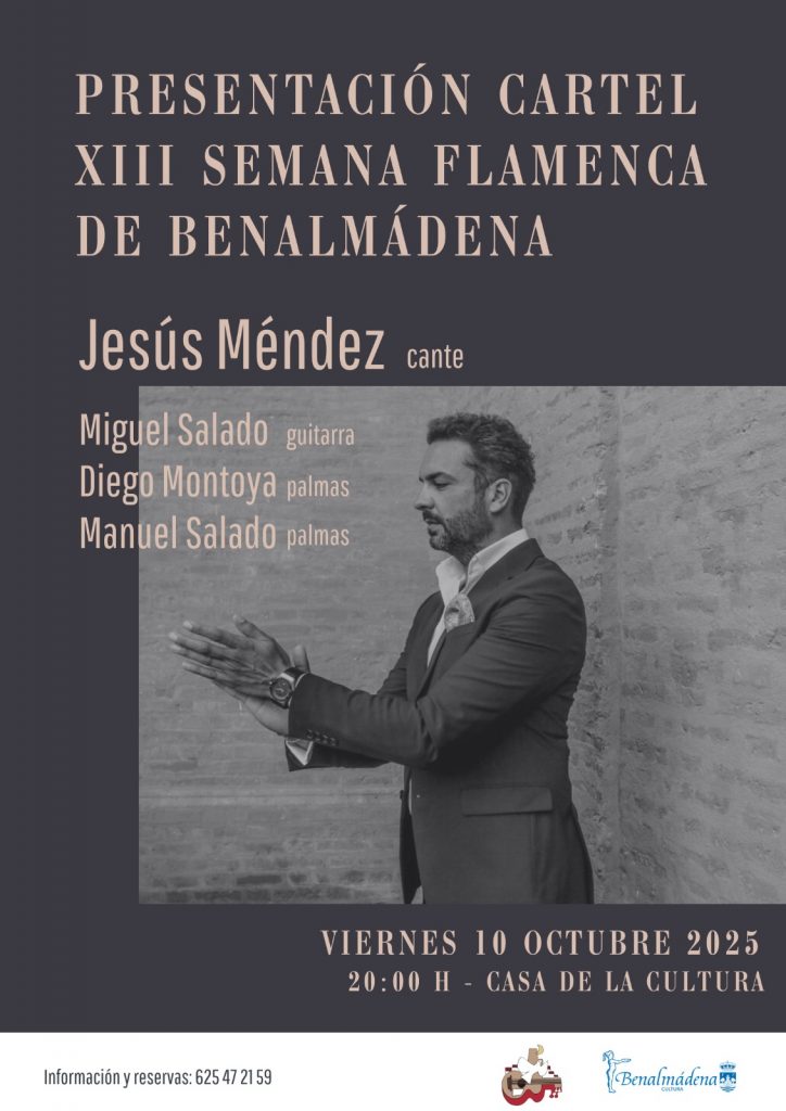 20.00 horas. Casa de la Cultura de Arroyo de la Miel. Presentación del cartel de la XIII Semana Flamenca de Benalmádena, organizada por la Peña La Repompa con la colaboración del Ayuntamiento benalmadense. Jesús Méndez, al cante, Miguel Salado, a la guitarra, y Diego Montoya y Miguel Salado, a las palmas.