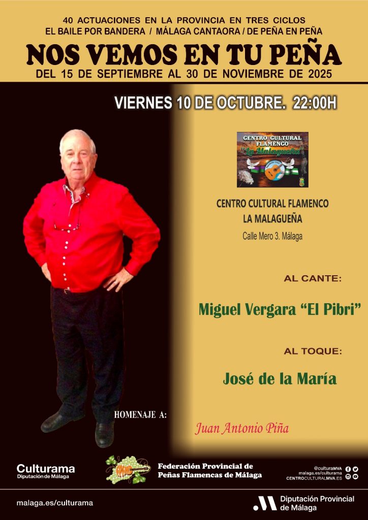 22.00 horas. Centro Cultural Flamenco La Malagueña de Málaga. Ciclo Nos vemos en tu peña, organizado por la Federación Provincial de Peñas Flamencas de Málaga con el patrocinio de la Diputación Provincial. Miguel Vergara El Pibri, al cante, y José de la María, a la sonanta.