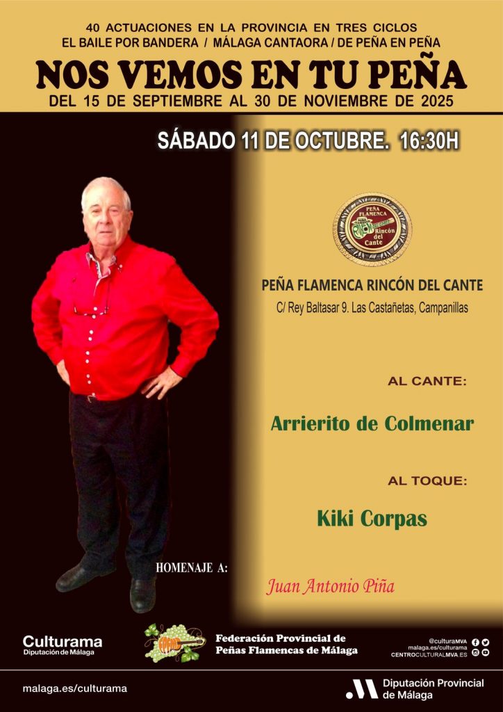 16.00 horas. Peña Rincón del Cante Las Castañetas de Campanillas, barrio de Málaga. Ciclo Nos vemos en tu peña, organizado por la Federación Provincial de Peñas Flamencas de Málaga con el patrocinio de la Diputación Provincial. Arrierito de Colmenar, al cante, y Kiki Corpas, a la sonanta.