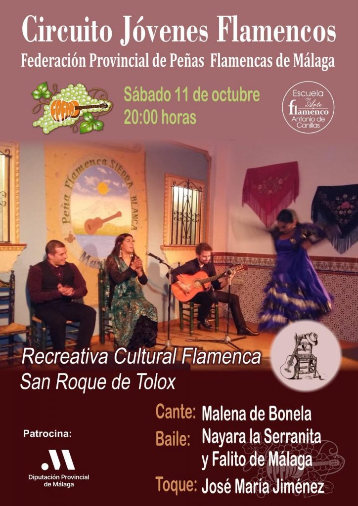 20.00 horas. Peña San Roque de Tolox. Circuito de Jóvenes Flamencos, organizado por la Federación Provincial de Peñas Flamencas de Málaga con el patrocinio de la Diputación Provincial. Nayara La Serranita y Falito de Málaga, al baile, Malena de Bonela, al cante, y José María Jiménez, al toque.