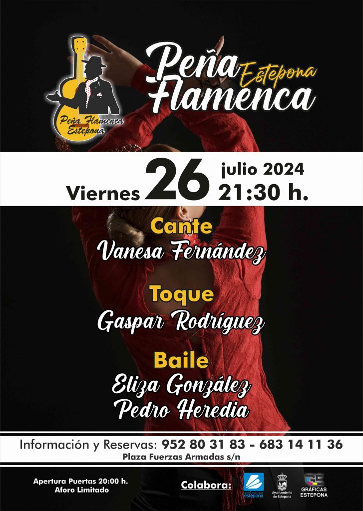 21.30 h. Peña de Estepona. Eliza González y Pedro Heredia, al baile, Vanessa Fernández, al cante, y Gaspar Rodríguez, a la sonanta.