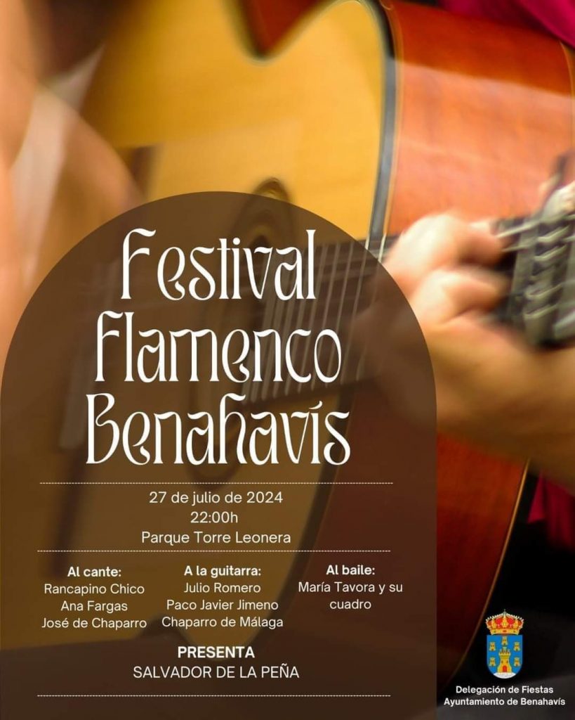 22.00 horas. Parque Torre Leonera. Festival de Benahavís. Rancapino Chico, Ana Fargas y José de Chaparro, al cante, Julio Romero, Paco Javier Jimeno y Chaparro de Málaga, a la guitarra, y María Távora y su cuadro, al baile. Presenta Salvador de la Peña.